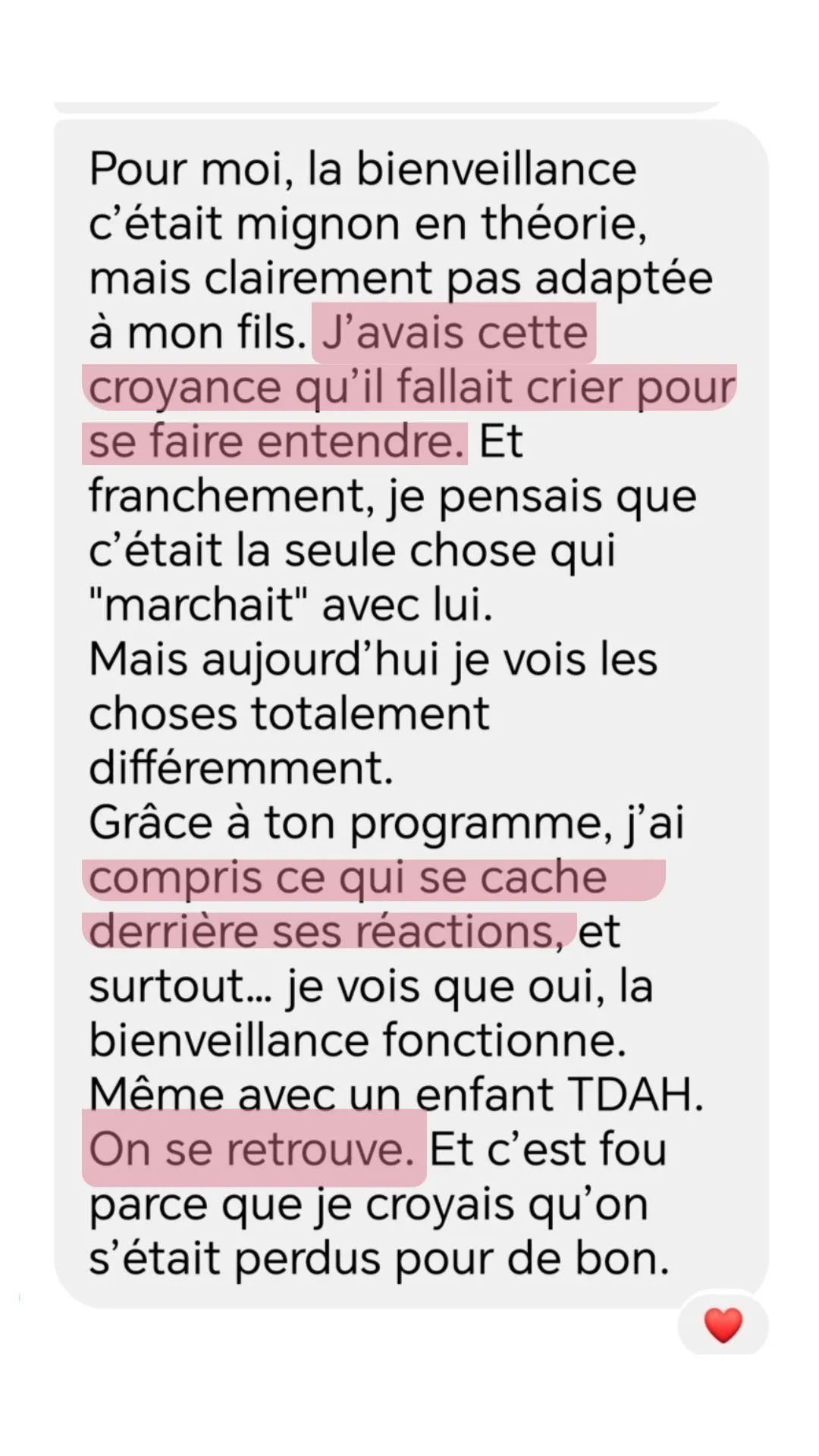 Pas de piège. Pas de fausse promesse.Juste une ressource simple, humaine, sincère… pour t’aider à retrouver un lien serein avec ton enfant.Parce que je crois profondément que chaque parent mérite de vivre une relation apaisée avec son enfant.